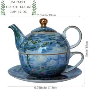 13安士瓷器一體式茶壺杯套裝,復古花卉陶瓷茶具,歐式茶壺茶杯碟三件套(水蓮花款)